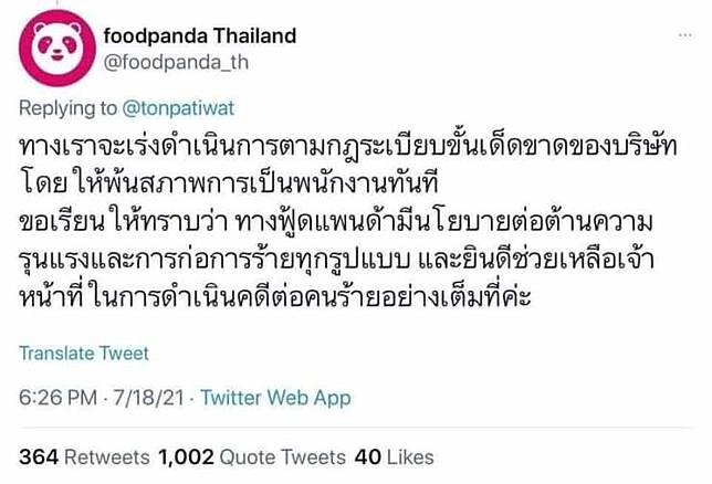 Foodpanda is one of the newcomers on the market, providing such promotions as free deliveries for customers and lower commissions for restaurants. ขณะที่ #แบนfoodpanda ติดเทรนด์อันดับที่ 2 โดยทวีตยอดนิยมปรากฏว่าเป็นทวีตของ foodpanda thailand @foodpanda_th ที่ตอบกลับถึงผู้ใช้ทวิตเตอร์รายหนึ่ง ระบุ ทางเราจะเร่ง. งานนี้มีประชาชนบางส่วนไม่พอใจกับการกระทำของ foodpanda เป็นอย่างมาก จนพากันติด #แบนfoodpanda พร้อมชวนกันลบแอปออกจากเครื่องทันที ชาวทวิตเตอร์แห่ ติด #แบนfoodpanda หากพบพนักงานเข้าร่วมชุมนุมจะพ้นสภาพพนักงานทันที พร้อมออกแถลงการณ์ ต่อต้านความรุนแรงและการก่อการร้ายทุกรูปแบบ. Foodpanda is a major company that activists are focusing on.